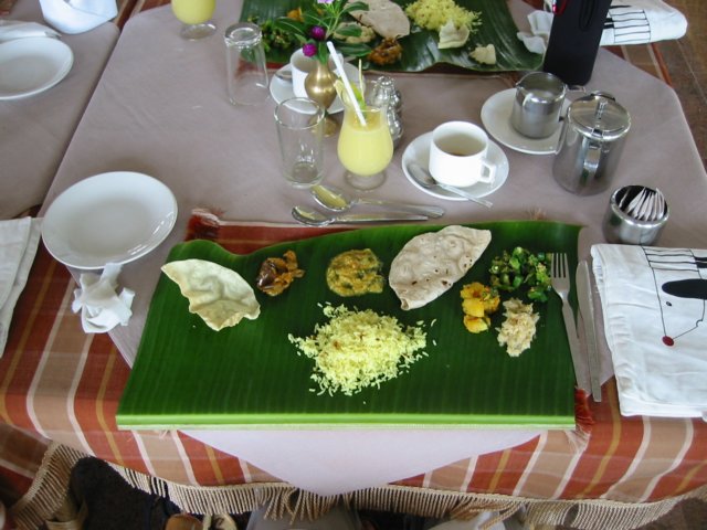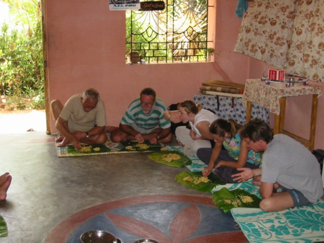 Volgende dag vroeg op, we gaan met de hele groep fietsen in de omgeving. Lunch bij een familielid van de plaatselijke gids in een klein “boerderijtje”. Wij krijgen rijst met allerlei soorten sausjes en bijgerechtjes op een palmblad opgediend, een thally. Dit blijkt later ook in restaurantjes de manier van serveren te zijn. Eten doe je natuurlijk met je rechterhand. Ik vraag toch maar om een lepel, smaakt net zo lekker!