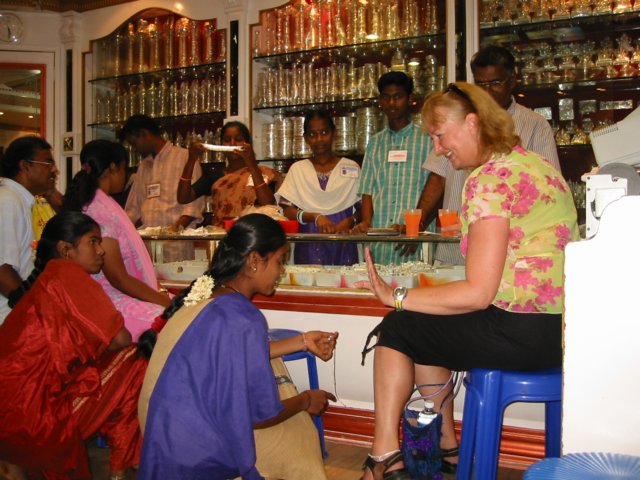 ‘s Middags in Madurai eerst op zoek naar een lunch. In de buurt van de tempel hebben we gauw een plekje gevonden, Indiase fast food, family restaurant. Dit type restaurant is meestal goed en goedkoop, een soort snelle hap dus.