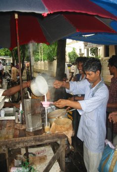 Het is zeer duidelijk off-season in Goa. Veel is gesloten. Het weer is zo, zo. Af en toe een flinke bui en af en toe breekt even het zonnetje door. We lopen naar het Benaulim strand en verwachten leuke ontbijttentjes tegen te komen. Dat valt dus tegen, maar als we dan toch iets vinden smaakt het uitstekend. Lekkere fruitsalade met yogurt voor mij en een overheerlijk puur mango-sapje. Ondanks mijn verzoek om vruchtensapjes altijd zonder ijs, zonder water, zonder suiker, trekt bijna niemand zich daar iets van aan.