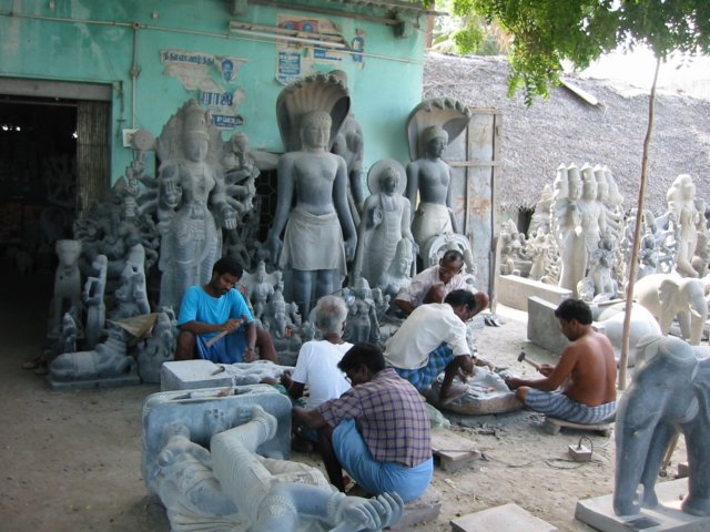 Mamallapuran is een echt beeldhouwerdorpje, sinds het een belangrijke haven in de Pallava dynastie was tussen de 5de en 9de eeuw. Overal hoor je het getik van de beitels op de kunstwerkjes in maak. Hele straten vol, hele vrachtladingen beelden en beeldjes.