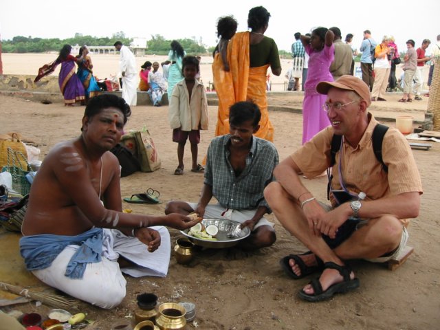 Ongeveer 4 uur vanaf Trichi een stop in een klein dorpje met een tempel met (weer) veel trappen. Ik heb wel even genoeg tempels gezien en trappen daarvoor gelopen maar Dirk gaat natuurlijk naar boven. Ik wandel lekker het dorpje door. Wat zijn ze toch aardig die Indiërs. Helemaal niet zo opdringerig als ik had verwacht, meeste vinden het gewoon enig om een paar woordjes engels met je te kletsen en op de foto gaan is helemaal een feest.